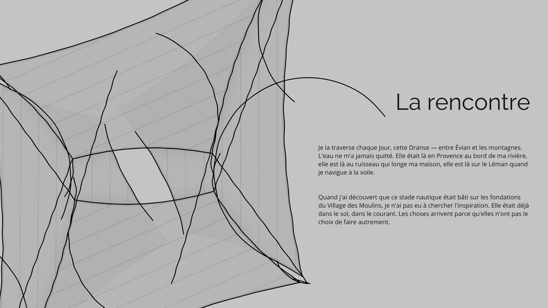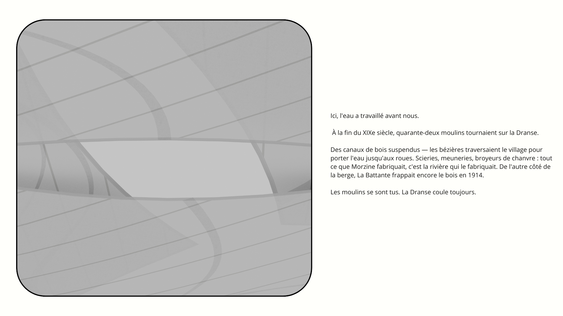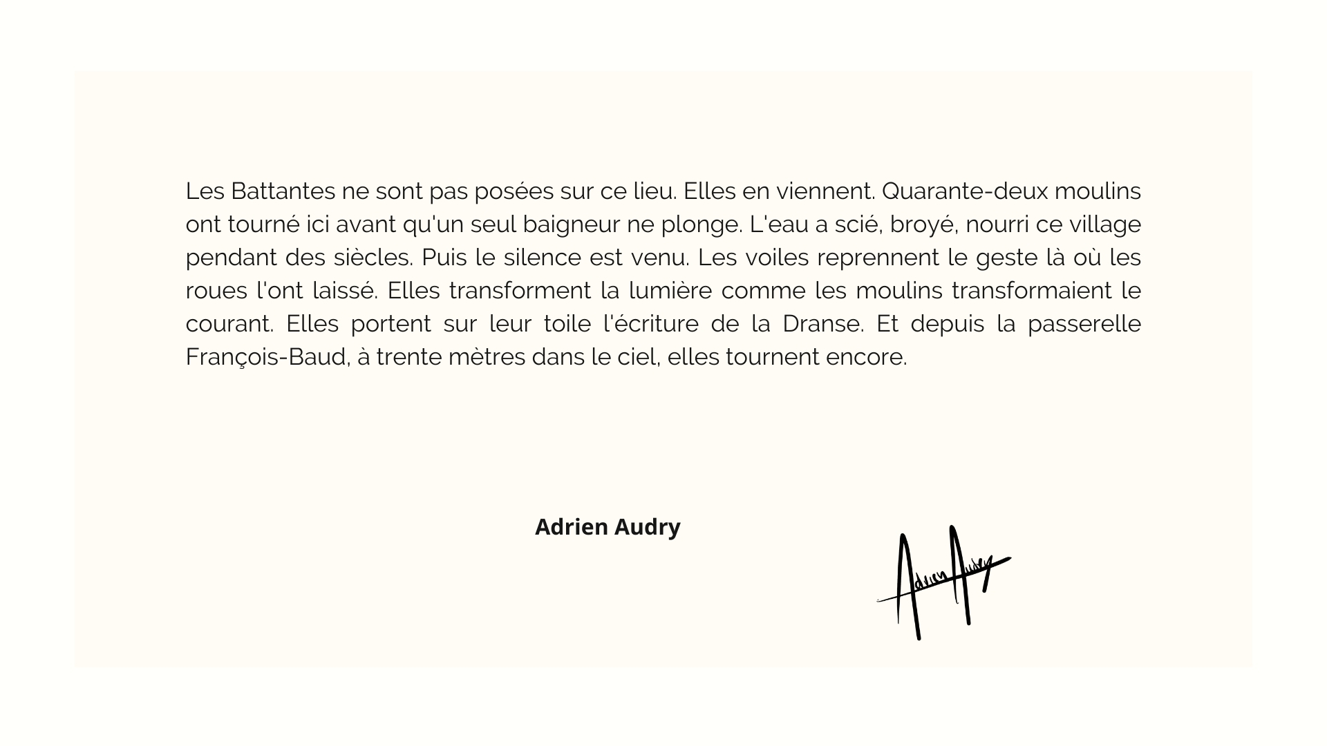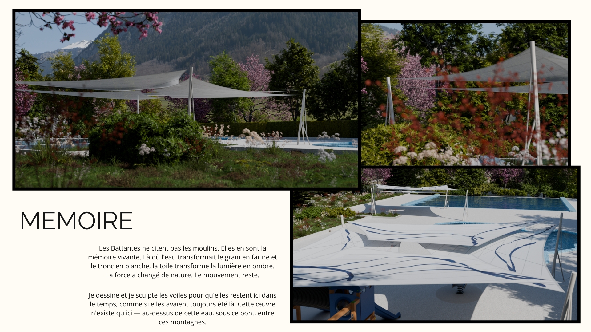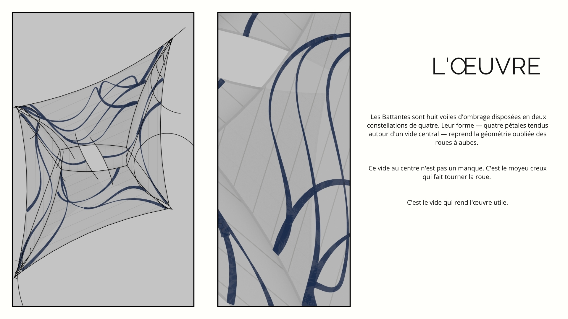 À Morzine, quarante-deux moulins tournaient autrefois sur la Dranse. Les Battantes reprennent la géométrie oubliée des roues à aubes : quatre voiles tendues autour d’un vide central, des courbes peintes à la main qui tracent le mouvement de l’eau sur