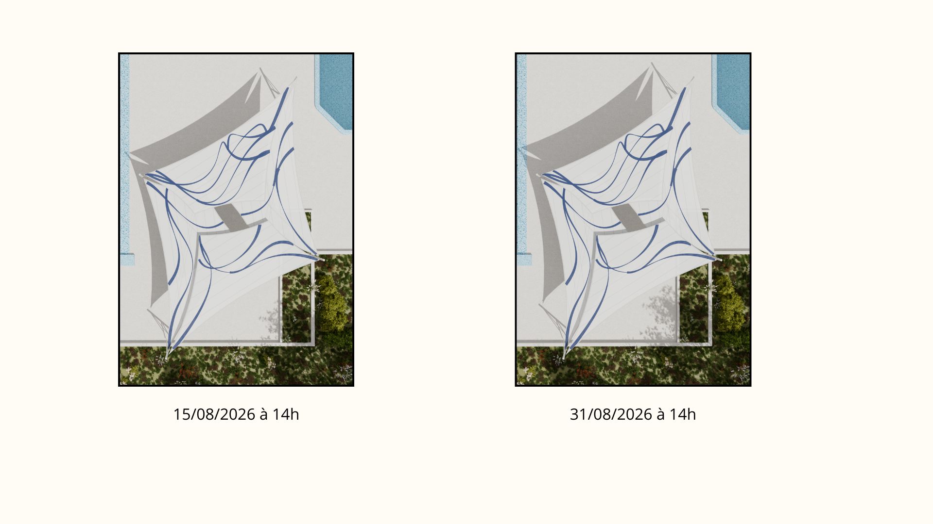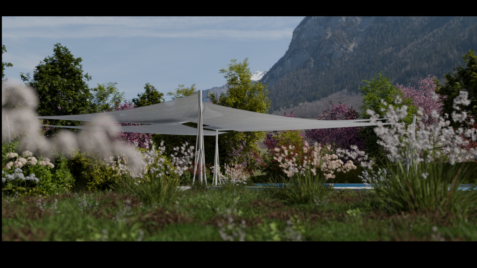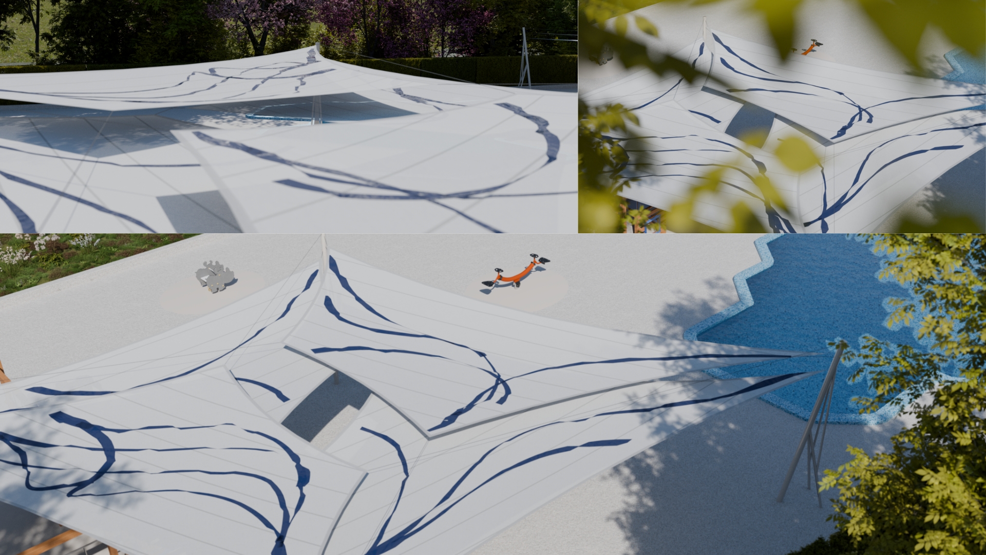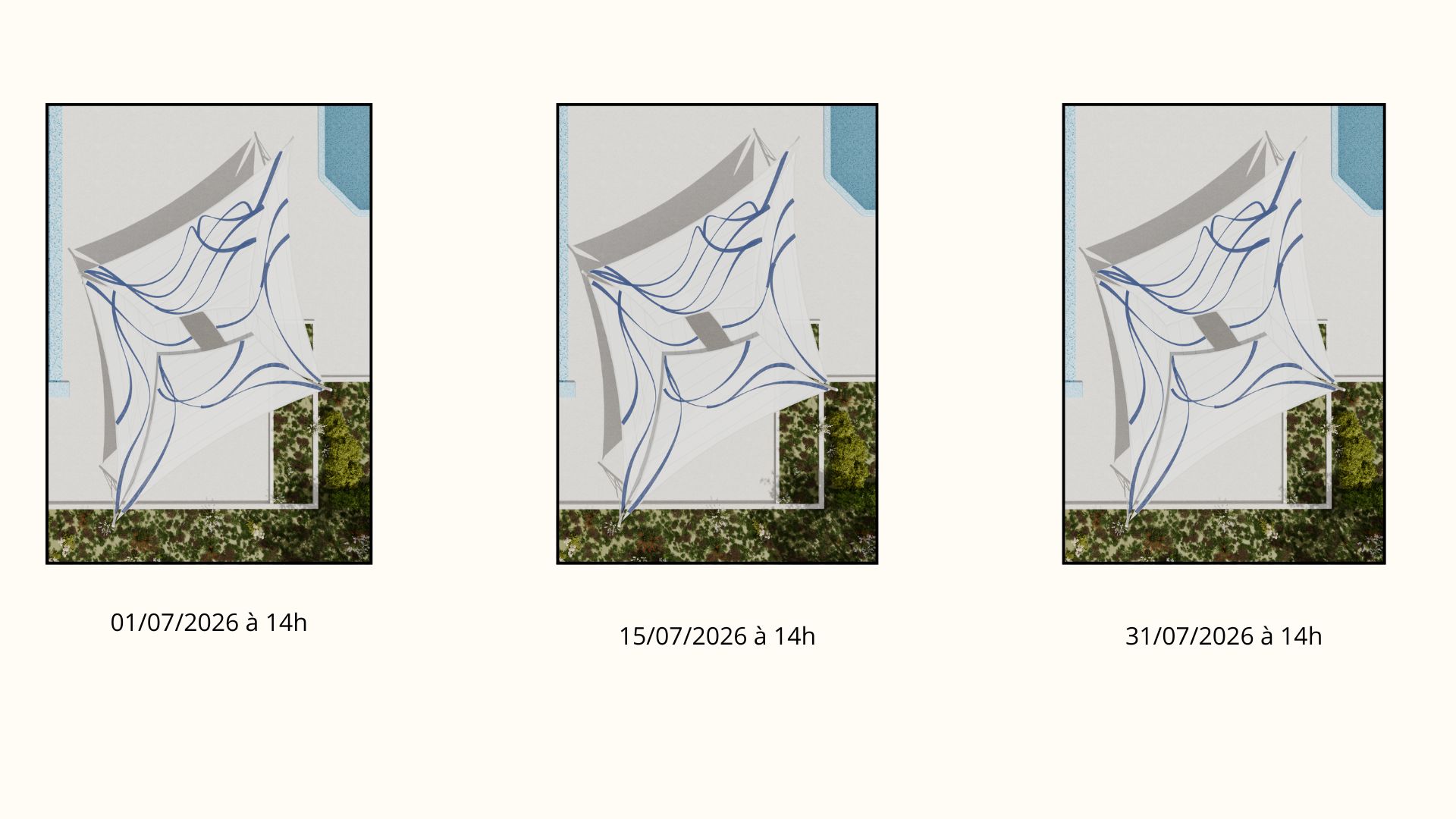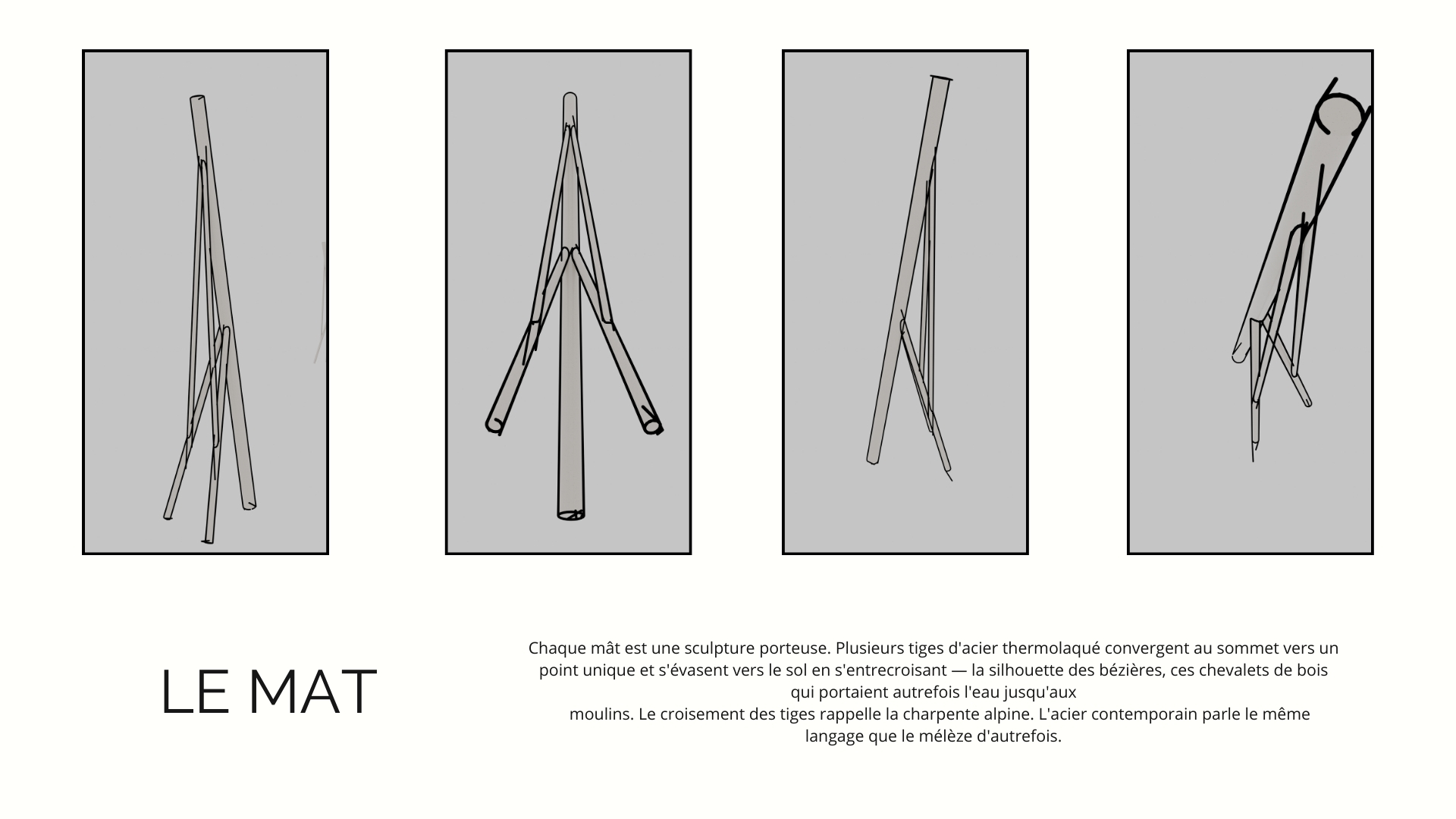 Les mâts sont dessinés pour l’occasion — des tiges d’acier thermolaqué qui s’entrecroisent et s’évasent vers le sol, reprenant la silhouette des bézières, ces chevalets de bois qui portaient l’eau jusqu’aux moulins.
