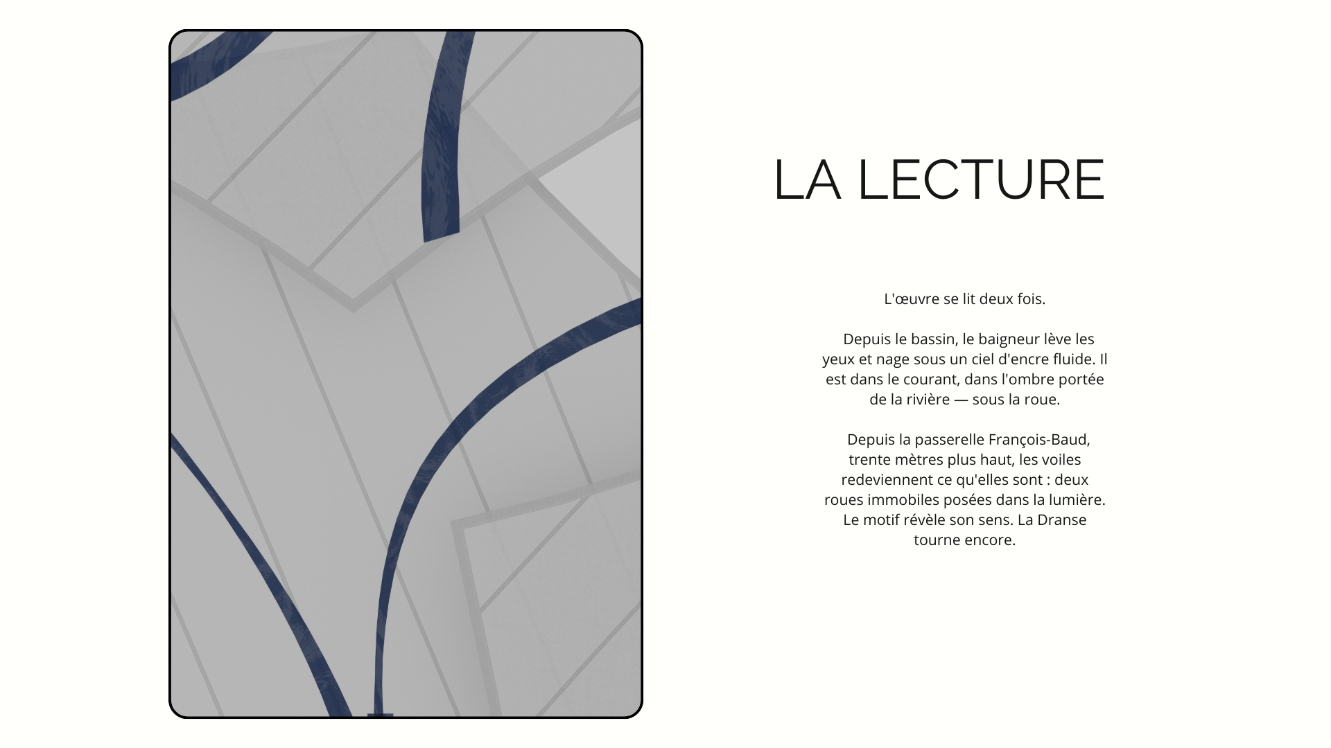 la toile. Depuis le bassin, on nage sous un ciel d’encre fluide. Depuis la passerelle François-Baud, trente mètres plus haut, les roues réapparaissent.